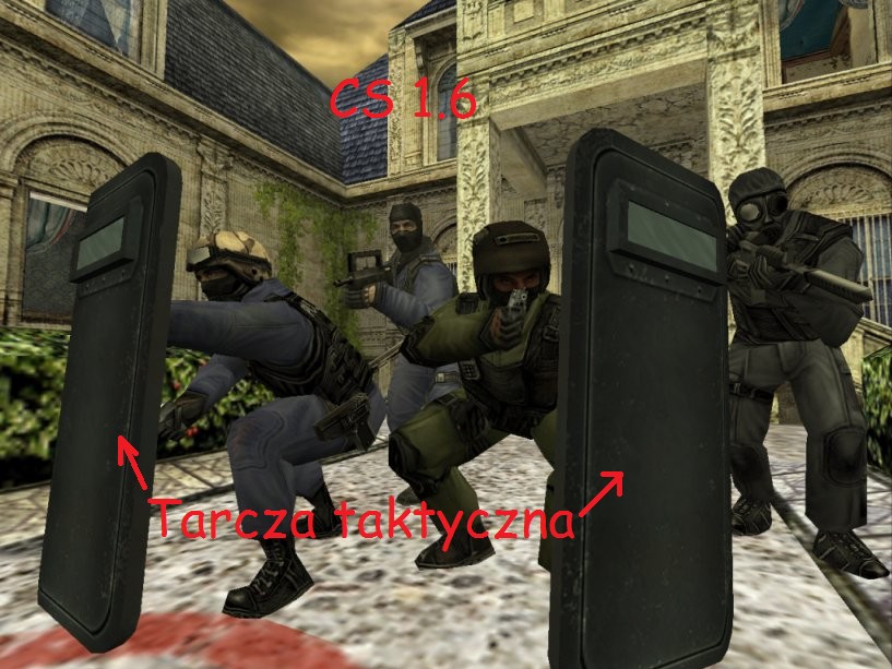 A więc tarcza taktyczna jest to jeden z podstawowych wyposażeń dzisiejszych oddziałów specjalnych praktycznie na całym świecie. Ta tarcza była od wersji cs 1.0 aż do 1.6, ale już w source nie było jej ze względu na e-sport, bo po prostu było trochę nie sprawiedliwe. Ten przedmiot był dostępny tylko po stronie antyterrorystów. Ta tarcza w klasycznym cs działa tak, że blokowała całkowicie obrażenia zadawane przez strzelanie i tylko nie wielka część stóp nam wystawały, lecz było tam tak czy siak trudno trafić, oczywiście jeśli się nią zasłonimy. Warto też wspomnieć o tym, że podczas zasłaniania się tą tarczą nie mogliśmy nic robić, oprócz poruszania się. Kiedy mamy tarcze to możemy mieć tylko pistolet bo oczywiście nikt by nie mógł w jednej ręce trzymać tarcza a z drugiej strzelać z karabinu.