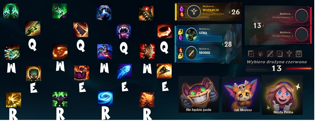 Teraz opowiem trochę o emotikonach, zmienionych ikonach umiejętności 4 postaci oraz etapie wyboru bohaterów. Emotikony, zwane emotki zostały niedawno wprowadzone i bardzo spodobały się graczom Ligi. W założeniu Riot, miały one być jedynie dodatkiem do rozgrywki, umilającym grę obu stronom nexusa. Aktualnie, mamy ich bardzo dużo do dyspozycji, można je podzielić na parę kategorii: zabawne(nie mające więkrzego przekazu), sytuacyjne oraz emotki z wydarzenia. Te używane jedynie dla fun-u mają wygląd np.: kciuk w górę, Zauroczenie czy Smutny kotek mają rozśmieszyć przeciwnika lub sojusznika i nie znaczą nic(z regóły). Emotki sytuacyjne mają poinformować przeciwnika lub sojusznika o twoich zamiarach, reakcji na daną sytuację np.: na linii, w grze lub o nieudanym ganku Mastera Yi ;). Istnieją również emotki z wydarzeń, np.: mistrzostwa, świąteczne i wiele, wiele innych wydarzeń takich jak Yasuo i Riven - przebudzenie mocy. Niedawno w patchu 7.24 zostały zaktualizowane ikony umiejętności 4 postaci: Ammumu, Nunu, Renekton i Dr Mundo.Były one bardzo stare i nie pasowały już do klimatu gry więc postanowiono je zmienić. Według mnie są one po prostu piękne!!! Koleją zmianą pod koniec sezonu 7,League of Legends były animacje wyboru bohatera. Etap na którym wybieramy postać, którą chcemy zagrać w danej rozgrywce, został zmieniony wizualnie, teraz nasza "karta" ten mały prostokącik z naszym imieniem przywoływacza i wybraną postacią teraz się świeci na złoto, naszych sojuszników na niebiesko a przeciwników na czerwono(ukazałem to w mojej grafice tego podpunktu artykułu). Zmieniono również kategorie wyszukiwania bohaterów na: TOPlane, MIDlane, BOTlane, las/dżungla oraz support/pomocnik. Gdy mija czas na wybór championa, pojawia się pasek w zależności od drużyny, która aktualnie wybiera na kolory niebieski/czerwony. Podsumowując, ten sezon był pełen zmian, wpływających na rozgrywkę i ogólne spojrzenie na grę. Liczę, że kolejne lata z LoL-em będą jeszcze lepsze i przyniosą dużo dobrego. Dziękuję, miłych świąt i dużo bananków pod choinkę.