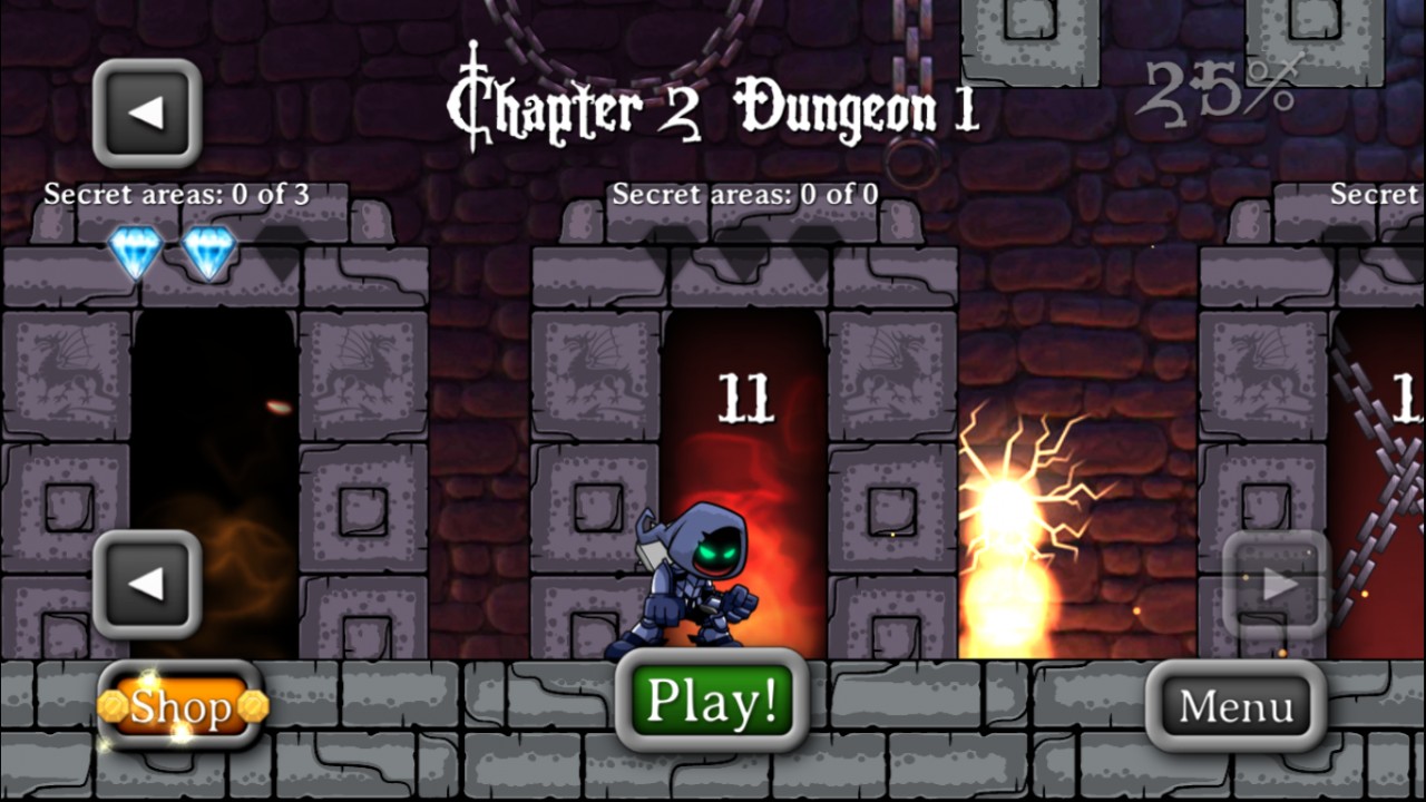 Mając szatę przypisaną wiatrowi jesteśmy niewrażliwi na kolce, mając szatę ziemi możemy skakać po specjalnych platformach, mając pierścień pod kategorią ciemności jesteśmy niewrażliwi na duchy, a mając broń przypisaną do światłości możemy przenikać przez świetlane ściany, które blokują każdą broń. To, co naprawdę jest tutaj pozytywne, to sekrety. Czy to dodatkowe monety, czy nawet specjalny ekwipunek, to wszystko można znaleźć będąc niesamowicie uważnym, skacząc nawet po platformach, na których wzrok się urywa. Jest też forma dodatkowych monet, które można zdobyć zbierając diamenty. Na każdy poziom przypada ich 3. Jak na grę mobilną jest dość wciągająca, jednak jest też trudna, z każdym poziomem jest coraz ciekawiej. Szkoda jednak braku płynnych animacji, jednak i tak jak na aplikację mobilną jest dobrze zrobiona. Polecam dla użytkowników tabletów.