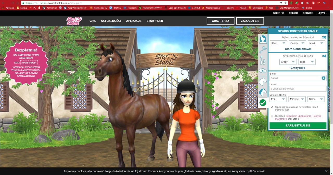 Star Stable jest naprawdę świetną grą. Może grafika tej gry nie zachwyca, jednak możliwość ciągłej jazdy konnej zachwyci nie jednego. W grze możemy mieć własnego konia oraz go upiększać różnymi dodatkami, tak samo jak naszą postać. Możemy pójść z nią do fryzjera, makijażystki, dokupić ubrania i wiele innych możliwości. Gra oferuje nam darmowe granie do 5 poziomu, dalej należy wykupić star rider. Dzięki niemu stajemy się Star rider'em na 3 dni oraz dostajemy 100 Star Coins, czyli drugą walutę w grze (główną walutą są Szylingi Jorvik). Kod promocyjny możemy znaleźć na stronie przy tworzeniu postaci i jej konia. Myślę, że jest to bardzo dobre posunięcie ze strony twórców gry.