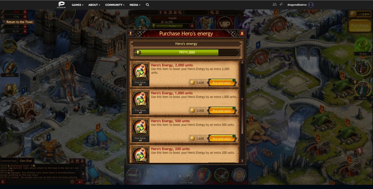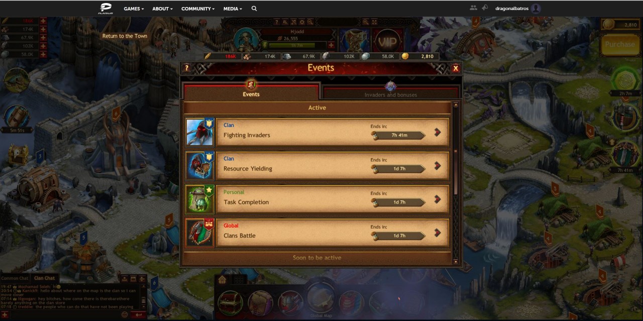 Twórcy Vikings: War of Clans systematycznie przygotowują co drugi dzień nową porcję eventów, które można podzielić na 3 główne typy: prywatne, klanowe i globalne. Prywatne eventy jak sama nazwa wskazuje dotyczą zadań wykonywanych przez naszego bohatera dla naszego królestwa. Mogą to być zarówno zadania premiowane punktami za wykonywanie tzw tasków, walki z tzw najeźdźcami. Wykonywanie ich jest banalnie proste i nie absorbuje praktycznie w ogóle naszego czasu. W przypadku tasków mamy je z lewej strony lub możemy je wywołać klawiszem Z. Wybieramy konkretne i oczekujemy określony czas i to tyle. Zadania typu walcz z najeźdźcami wymagają od nas przejścia do global map i wyszukania np "royal guardsman" czy też "wild boar" i zaatakowaniu go. Najeźdźców ogólnie jest kilka typów oraz mają poziomy od 1 do 6.