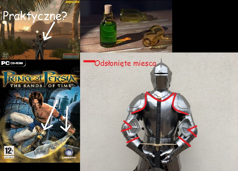 Kolejnym naszym tematem są wolne i szybkie ciosy. Faktem jest to, że w czasie walki bronią białą musimy się postarać o to aby nasze ciosy były jak najmniej widoczne i bardzo szybkie. Robienie wielkiego zamachu, czyli tak jakby w grach wolne, ale mocne uderzenie pokazujemy przeciwnikowi swoje intencje co pozwala mu ten cios uniknąć, a nawet wykorzystać go przeciwko nam. Kiedy będziemy starać się zamachnąć bardzo mocno to dajemy naszą broń za głowę i odsłaniamy cały nasz przód co pozwala naszemu nie przyjacielowi nas zranić, a gdyby nas nie zaatakował tylko nic by nie zrobił to i tak zauważył by, gdzie chcemy wykonać cios, i dzięki temu będzie mógł zrobić prosty unik. Szybkie ciosy to myślę, że już bardziej leżą w rzeczywistości niż te wolne i mocne. Naszym kolejnym tematem są rodzaje mieczy taki jak na przykład kolce na mieczy. Były one stosowane i momentami dosyć przydatne, jeśli nasz przeciwnik miał na sobie samą kolczugę. Jeśli rycerz dobrze się zamachnie to ząbki mogą się wbić na dziurki w kolczudze, a potem ją rozerwać. Tak więc były one dosyć przydatne. Często w grach spotykamy się z dwiema broniami używanymi na raz w takim na przykład Gothic 3. Aby rycerz mógł korzystać z dwóch broni na raz to musiał być to specjalny zestaw, tak aby podczas machania jedna broń nie przeszkadzała drugiej, czyli jedna broń musiała być krótsza od drugiej. Dobre dobranie dwóch broni było w Prince of Persia Piaski Czasu, gdzie nasz bohater posługuje się mieczem i sztyletem, który był znacznie krótszy od miecza.