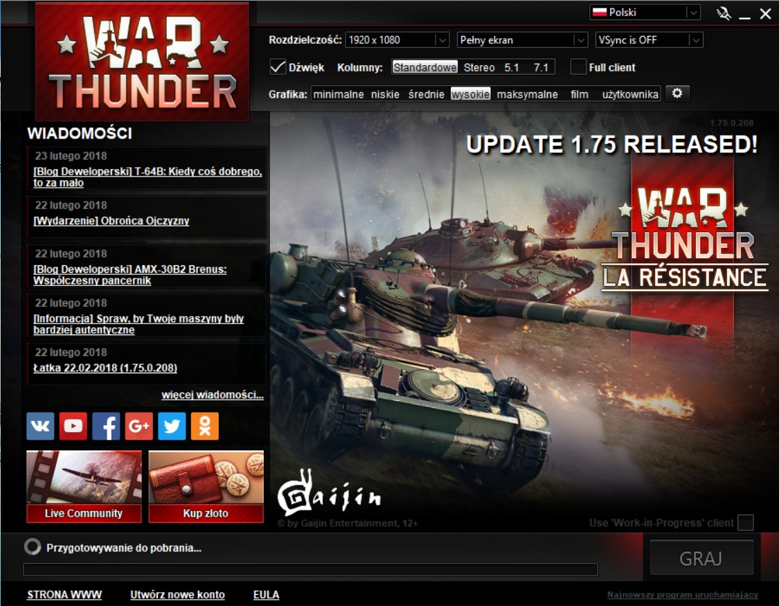 Gaijin.net nie jest ,,raczkującą'' firmą gdyż na swoim koncie mają miedzy innymi takie produkcje jak Crossout oraz Star Conflict. Niestety ale War Thunder nie cieszy się dużą popularnością z powodu między innymi mikropłatności tak zwane w grze złote orły za które można kupić samoloty niedostępne dla ludzi którzy nie wydali na tą grę nic ale moim zdaniem nie ma co się dziwić gdyż ta gra jest popularnym w ostatnim czasie modelem free2play co to oznacza? Że można pograć tą grę całkowicie za darmo z ich strony internetowej. War Thunder jest grą bardzo dobrze przyjmowaną przez graczy którzy zdecydowali się ją pobrać a przynajmniej przez większość. Instalacja jest bardzo prosta bo wystarczy tylko wcisnąć przycisk pobierz i rozpoczyna się pobieranie na zdjęciu widać launcher.